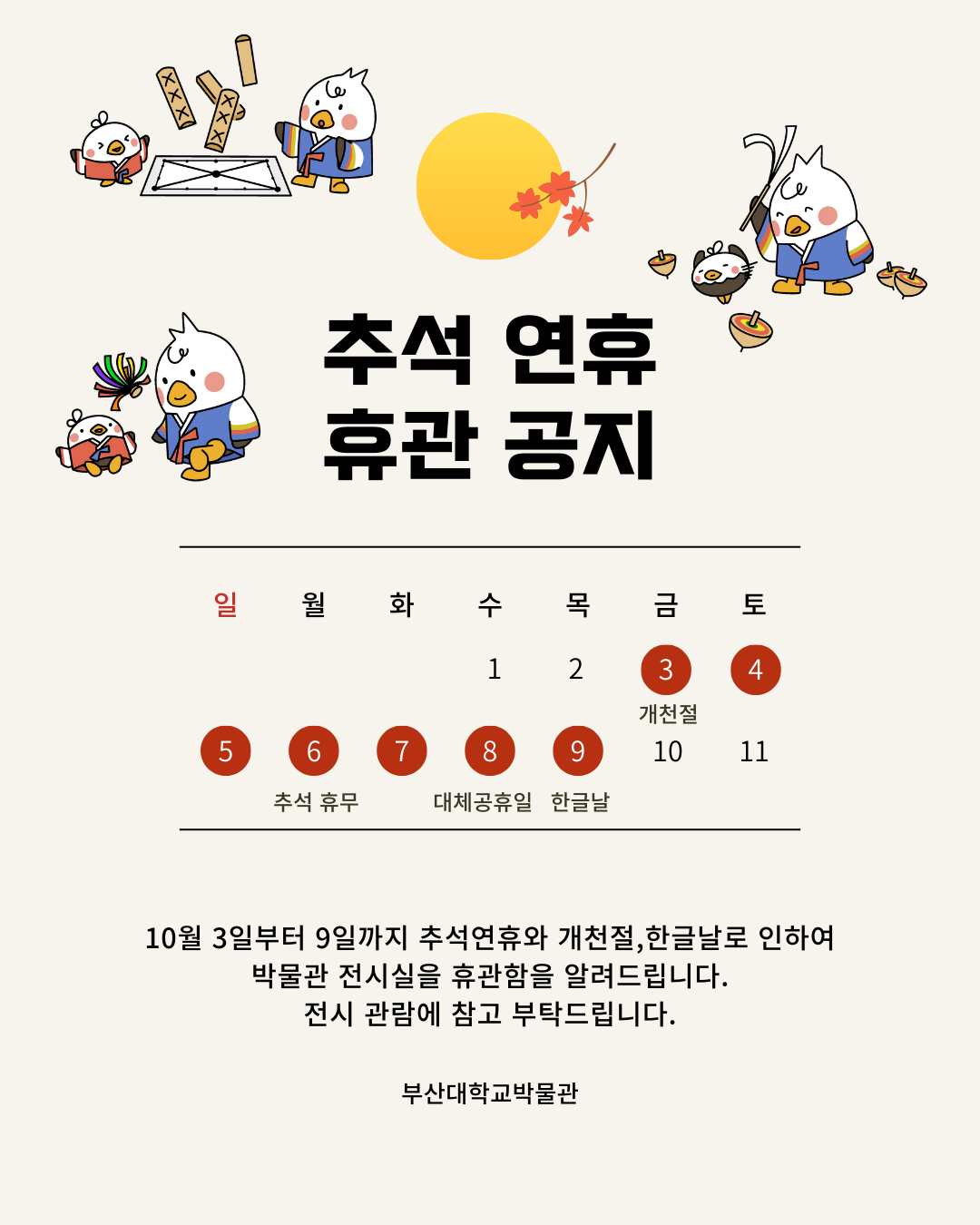 fnctId=bbs,fnctNo=13298 [공지] 추석 연휴 박물관 휴관 안내 date 2025.09.22 name 박물관 e-mail view 44 2025년 추석 연휴 기간 중 휴관일을 알려드립니다. 첨부파일 첨부파일이(가) 없습니다.
